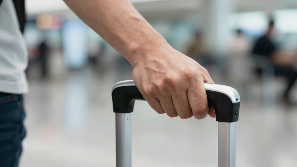 Wrist position plays a crucial role in preventing strain and fatigue when handling luggage, especially during long travel days. Poor wrist alignment can lead to discomfort because your wrist’s flexibility is compromised, forcing muscles to overwork. The handle material also matters; rough or rigid handles increase pressure points, aggravating strain. To minimize fatigue: 1. Maintain a neutral wrist position to avoid overextending or bending. 2. Choose luggage with handles made from soft, ergonomic materials that reduce pressure. 3. Regularly adjust your grip to prevent repetitive strain on the same muscles. 4. Using proper grip techniques can also help distribute pressure evenly and reduce fatigue. Additionally, selecting ergonomic handle designs can further improve comfort and reduce strain during extended use. Ensuring the correct handle height aligns with your wrist angle is essential in maintaining proper wrist posture and preventing fatigue during travel. When your wrist is misaligned, it forces your muscles and tendons to work harder, resulting in fatigue. Proper wrist positioning not only improves comfort but also prevent injury and enhances overall efficiency. Properly adjusting your luggage handle height can also help prevent repetitive stress injuries and improve overall comfort.