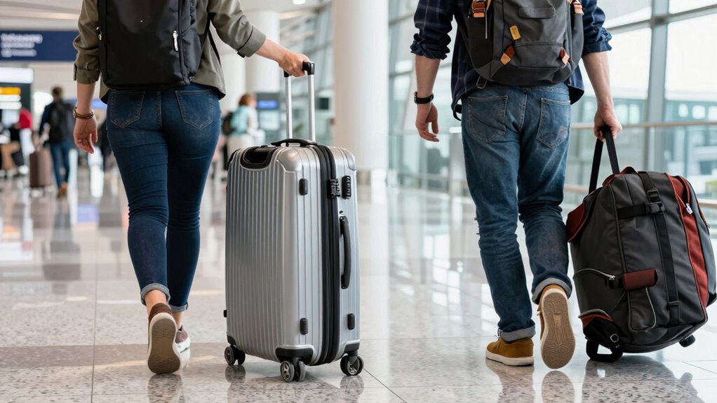 Choosing between carrying and rolling your suitcase can substantially impact your travel energy. Studies show that rolling luggage reduces fatigue by up to 40% compared to carrying, helping you stay alert and comfortable. By selecting the right method based on your trip’s length and terrain, you’ll conserve energy and enjoy your journey more. So, consider your luggage choice carefully—your body will thank you, and you’ll arrive feeling refreshed and ready to go.