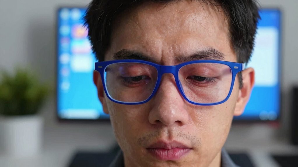 Extended screen time often leads to eye strain because your eyes have to work harder to focus on digital displays. This increased effort causes digital eye strain, resulting in discomfort, dryness, and blurred vision. Poor vision ergonomics, like improper screen height or lighting, worsens these symptoms. The 20-20-20 rule helps by giving your eyes regular breaks, reducing strain. When you look away every 20 minutes, you relax your eye muscles and prevent fatigue. To maximize its effectiveness, consider these tips: