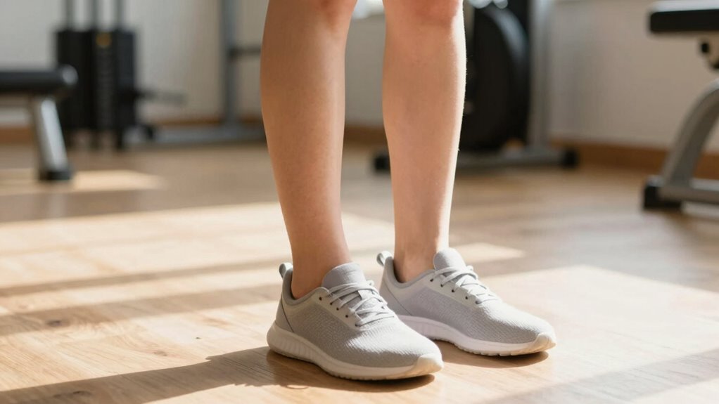 Establishing a consistent routine is key to making progress with calf raises, but it’s equally important to stay attuned to your body’s signals. Start each session with a simple warm-up routine to prepare your muscles and reduce injury risk. Consistency helps build strength and endurance over time, so aim to perform calf raises regularly, but listen for signs of fatigue or discomfort. Staying hydrated is vital—use hydration strategies to keep your muscles functioning at their best and prevent cramps. Pay attention to how your calves respond; if you feel pain or excessive soreness, it’s a cue to rest or modify your routine. By maintaining a steady schedule and respecting your body’s limits, you’ll foster sustainable progress and avoid setbacks.