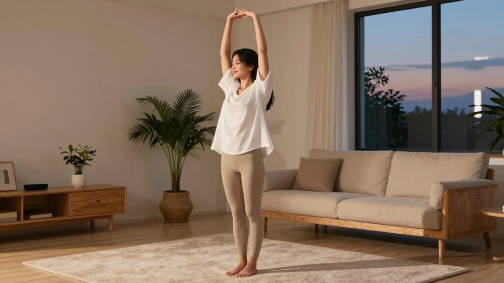 A gentle evening stretching routine focused on “less is more” helps you unwind and prepares your body for restful sleep. Keep it simple by choosing calming stretches like neck rolls, shoulder shrugs, and spinal twists, performed slowly and mindfully. Create a peaceful space, breathe deeply, and stick to a short, consistent routine each night. If you want to discover easy steps to develop this relaxing habit and tackle common issues, keep exploring.