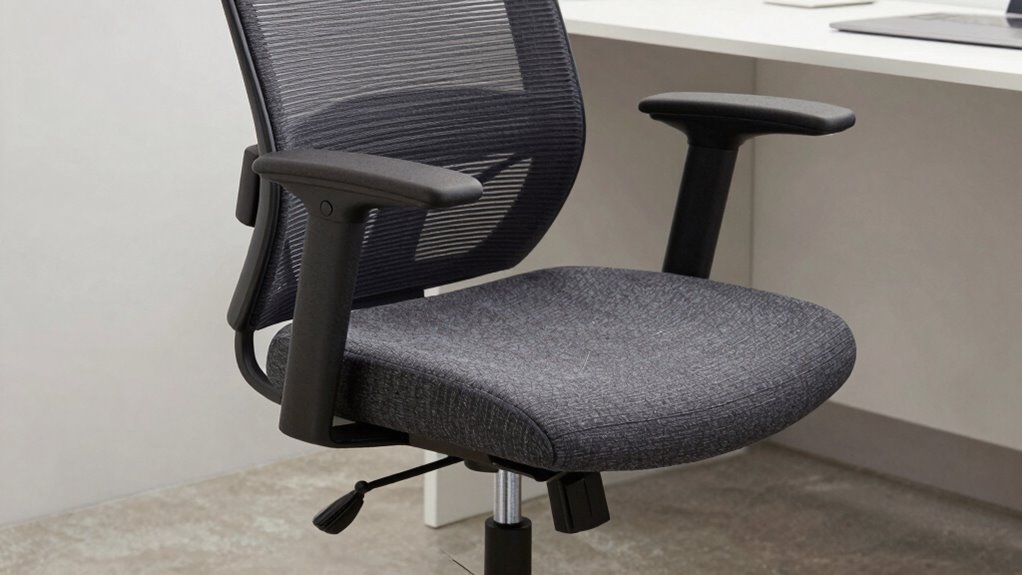 Adjusting your seat height properly is essential to guarantee maximum comfort and support throughout your workday. When your seat height is correct, your feet should rest flat on the floor or on an ergonomic accessories like a footrest, with knees at a 90-degree angle. For short legs, consider using a leg extension or adjustable footrest to improve support and reduce pressure on your thighs. Proper height adjustment helps prevent slouching and promotes better posture. Ensuring your ergonomic setup is correct can also help minimize discomfort and prevent long-term strain. Additionally, good posture habits play a crucial role in maintaining spinal health and overall well-being. Recognizing personal anthropometrics can guide you toward more effective ergonomic adjustments tailored to your body, fostering a more calm and focused workspace. Being aware of your unique body measurements can further optimize your ergonomic configuration for lasting comfort.