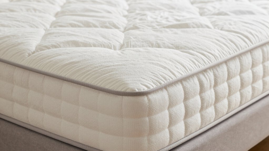 Different mattress types offer varying levels of edge support, which can markedly impact your overall comfort and durability. Foam mattresses often lack strong edge reinforcement, making the mattress perimeter feel less stable and limiting sitting space. In contrast, innerspring mattresses usually provide solid edge support due to their coil systems, offering a more supportive mattress perimeter. Hybrid mattresses combine foam comfort layers with reinforced coils, enhancing edge stability without sacrificing softness.