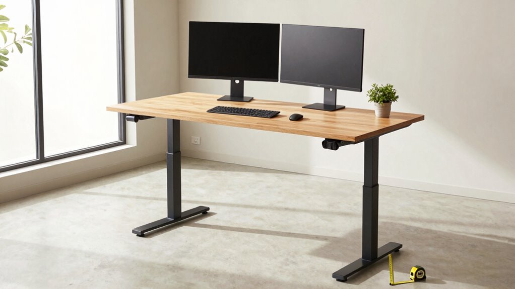 To measure ceiling height for a standing desk, start by noting the total height from floor to ceiling. Subtract the desk clearance needed for comfortable movement and your preferred standing height, usually around 48 to 50 inches. Make sure there’s enough space above the desk for your monitor and accessories. This will help you determine if your ceiling height accommodates the desk comfortably and allows for ergonomic setup.