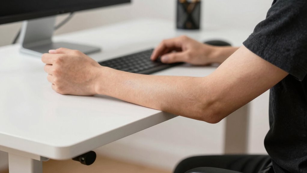 Many people unknowingly compromise their forearm and elbow posture by making simple mistakes while using a standing desk. One common error is neglecting wrist alignment, causing your wrists to bend or twist unnaturally, which puts strain on your forearms and can lead to discomfort. Another mistake is failing to relax your shoulders; tense or raised shoulders force your elbows into awkward positions, affecting overall posture. Keep your wrists in a neutral position, avoiding flexion or extension, and ensure your shoulders stay relaxed and down. These small adjustments help maintain proper forearm and elbow alignment, reducing fatigue and minimizing the risk of repetitive strain injuries. Paying attention to these details makes a significant difference in your comfort and long-term health at your standing desk.