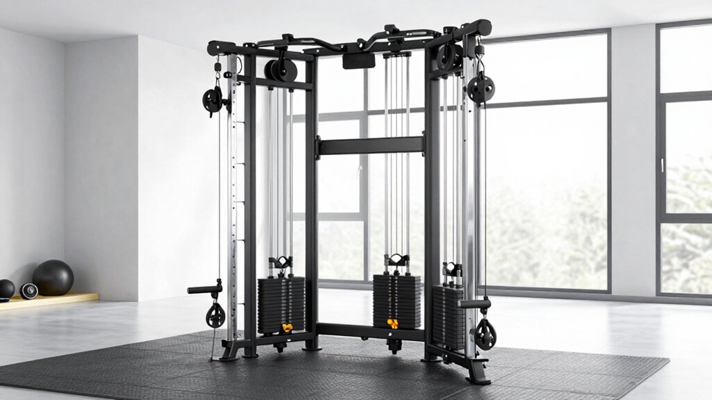 You’ll want a dedicated space roughly 6 to 8 feet wide and about 8 to 10 feet deep to comfortably set up a home gym cable system. While it might seem like a modest corner at first, this space allows you to move freely and perform a variety of exercises securely. Keep in mind, a clear, unobstructed area guarantees you get the most out of your workouts without feeling cramped.