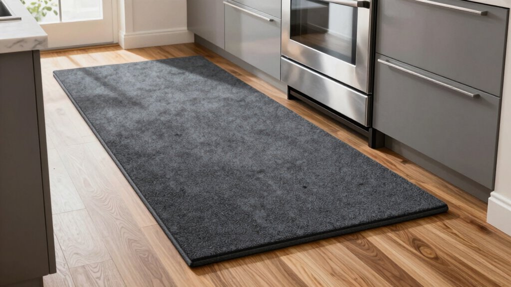 Selecting a durable anti-fatigue kitchen mat involves evaluating the quality of its materials, as these determine how well it withstands daily wear and tear. High-quality mats are typically made from sturdy materials like PVC, polyurethane, or high-density foam, which resist tearing, deformation, and flattening over time. The surface should also resist stains, scratches, and abrasion to keep its appearance intact despite heavy foot traffic. Reinforced backing and edges are essential—they prevent fraying and curling, maintaining safety and support. Material thickness, usually between 0.4 and 1 inch, impacts both cushioning and durability. Additionally, water and stain resistance help protect the core from moisture damage and staining, ensuring the mat’s longevity and consistent performance in your busy kitchen.