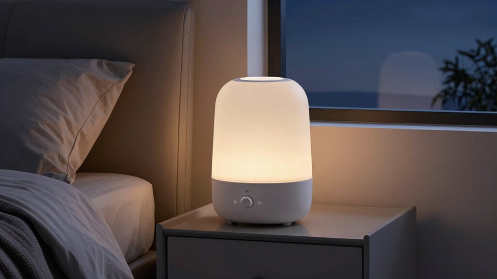 Choosing a bedroom humidifier that operates quietly is essential for maintaining a peaceful sleeping environment. Ideally, it should produce noise levels below 30dB, which is considered quiet enough for undisturbed sleep. Ultrasonic humidifiers are popular for this reason, typically emitting sounds around 23-28dB, thanks to high-frequency atomization technology that minimizes mechanical noise. Noise levels can vary depending on mist output settings; lower settings tend to be quieter, further reducing disturbance. A near-silent humidifier helps create a calm atmosphere, especially important for light sleepers or nursery use. When selecting a premium model, pay close attention to its noise specifications to guarantee it won’t interfere with your rest, allowing for a serene, comfortable sleep environment night after night.