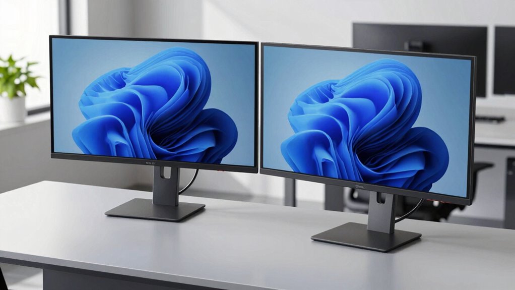 To guarantee your dual monitor setup is both comfortable and ergonomic, it’s essential that the arm offers a generous range of adjustability. A wide tilt range, typically from 85° up to -30°, allows you to position your monitors at the most comfortable viewing angles. Swivel capability of at least 180° enables flexible positioning, whether you’re multitasking or sharing screens. Rotation features that support 360° adjustments for landscape or portrait orientation help accommodate various workflows and presentations. Additionally, smooth height adjustments, often using gas springs or telescoping columns, let you easily find the perfect eye level. An extension length of up to 25 inches or more provides extensive customization, ensuring your monitors are positioned ideally for comfort and efficiency.