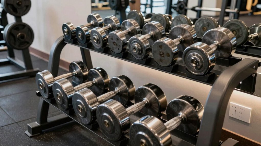 Think of a dumbbell rack as the guardian of your workout space; safety features are its armor. Look for sturdy, non-slip bases to prevent wobbling, secure locking mechanisms to keep weights from toppling, and smooth, rounded edges to prevent injuries. Adjustable shelves should lock firmly, and a stable design ensures your workout remains safe and focused. These features convert your rack into a reliable partner in your fitness journey.
