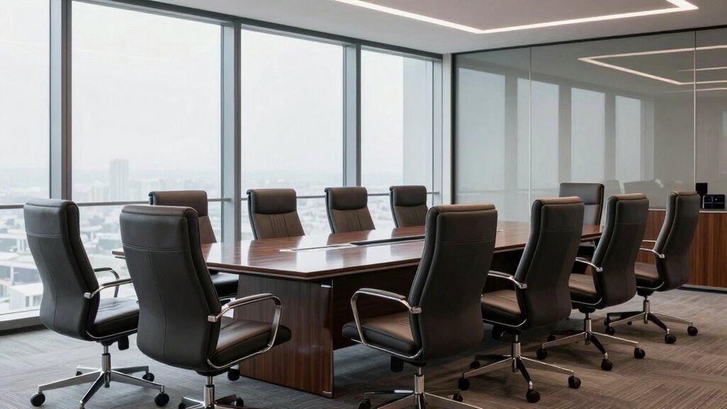 Choosing ergonomic conference room chairs with sufficient weight capacity and stability is essential for guaranteeing safety and comfort during long meetings. High-end chairs typically support weights from 275 to 330 pounds, accommodating a wide range of users. A sturdy five-star base with reinforced materials enhances stability and prevents tipping, even during extended use. Chairs with broad, wide seats and reinforced frames distribute weight evenly, reducing stress on individual components and boosting durability. Adjustable features like pneumatic height and tilt mechanisms help lock the chair securely in place, maintaining a stable seating position. Durable casters and a well-designed base further prevent wobbling on various floor surfaces. Prioritizing these factors ensures safety, balance, and long-term reliability in your conference room seating.