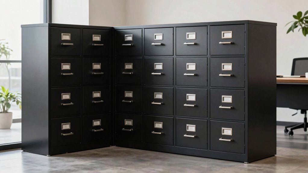 Did you know that lockable filing cabinets substantially reduce theft risk by up to 90%? I believe they’re quite secure against tampering and theft, especially when equipped with high-quality locks. I always recommend choosing cabinets with sturdy materials and reliable locking mechanisms. While no lock is completely foolproof, a well-designed lockable cabinet offers strong protection for your valuables and sensitive information, giving you peace of mind.