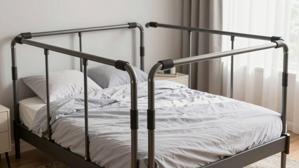 Selecting a heavy-duty bed rail isn’t just about strength; it’s also about ensuring it fits your bed properly. First, check that the rail matches your bed size—twin, full, queen, or king—to guarantee a snug fit. Next, verify the mattress thickness support, usually between 4 and 16 inches, so the rail stays secure. It’s also important to confirm compatibility with your bed frame type, whether it’s a platform, upholstered, or metal frame, and avoid adjustable or recessed frames that might not work. Additionally, consider the overall bed height, including the mattress, ensuring it falls within the rail’s supported range, typically 21 to 29 inches. Finally, choose an installation method that suits your bed—whether it slides under the mattress, uses clamps, or requires no tools.