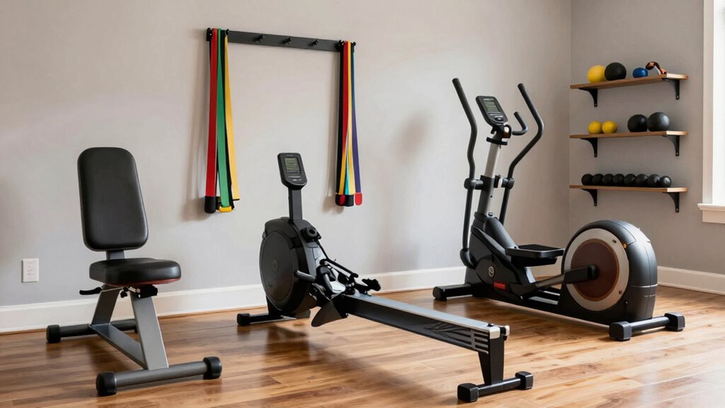 When selecting a home gym machine for rehab, I focus on key factors like adjustable resistance options and low-impact movement features to guarantee safe, effective workouts. Space requirements and ease of use also matter because they influence how comfortably I can incorporate the equipment into my routine. Above all, I prioritize safety and stability to prevent injuries and promote confidence during every session.