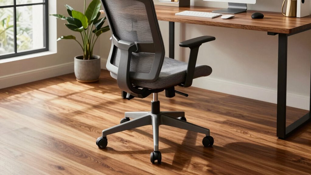 Choosing the right home office chair for hardwood floors means paying close attention to its floor compatibility features. I look for chairs with soft, non-marking casters made from polyurethane or rubber to avoid scratches and damage. A wide, stable base helps distribute weight evenly, reducing pressure points that could harm delicate flooring. I also check for floor-friendly features like felt pads, rubber rings, or non-slip bases to improve stability and further protect surfaces. Adjustable height and tilt functions are important, too, because they help minimize unnecessary movement that can cause wear on the floor. Finally, I verify that the casters are specifically designed for hardwood surfaces, ensuring smooth movement without slipping or scratching. These features make a huge difference in maintaining the beauty of my floors.
