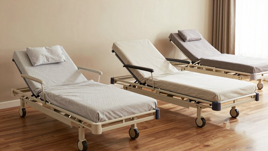 Ever wonder how to guarantee your hospital-style adjustable bed offers the best comfort and support? The key is choosing the right mattress compatibility options. First, confirm the bed frame supports standard hospital or twin XL mattresses, as sizes and designs vary. Look for mattresses with pressure redistribution layers like gel-infused memory foam, which enhance comfort and relieve pressure points. Check that the mattress material is CertiPUR-US or Oeko-Tex Standard 100 certified to guarantee safety and the absence of harmful chemicals. Waterproof or water-resistant options can simplify cleaning and maintain hygiene. Finally, if pressure management is a priority—especially for long-term use or pressure sore prevention—select a mattress specifically designed for pressure relief. Compatibility is essential for comfort, safety, and longevity.