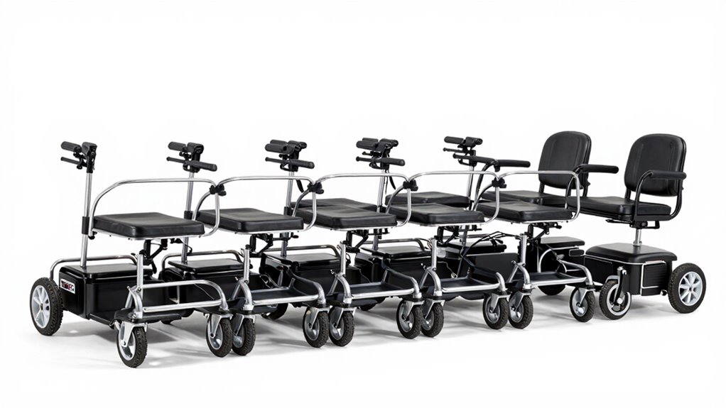 Think of a sturdy safety net catching you if you slip—this is what these walkers do. They include features like anti-slip tires, brakes that lock securely, and wide, stable bases to prevent falls. Some models even have reflectors for visibility and ergonomic handles for better grip. These safety features work together like a trusted guardian, giving you confidence and stability wherever you go.
