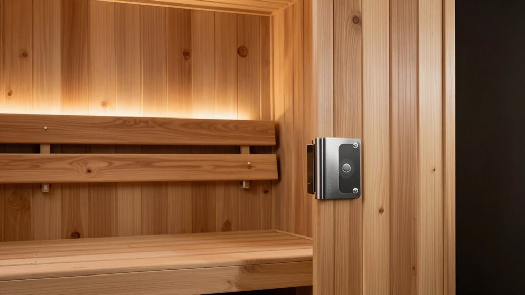 The full-height premium models come equipped with essential safety features like automatic shut-off, to prevent overheating, and temperature controls that let me set safe, comfortable levels. I also appreciate the sturdy construction and non-slip flooring, which guarantee stability. These safety measures give me peace of mind, knowing I can enjoy my sauna experience without worries. It’s reassuring to have these protections built in for my safety and peace of mind.