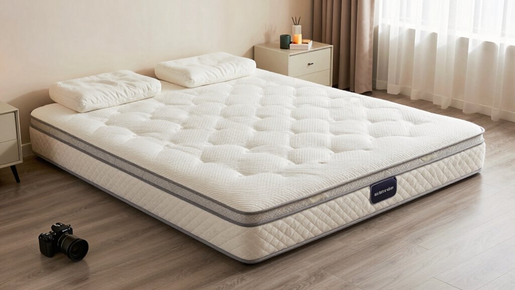 A high-quality support system is essential for a comfortable and supportive queen mattress under $1000. I look for mattresses with individually wrapped or pocketed coils, as they respond independently to movement, providing better support and reducing transfer. The gauge and number of coils matter—thicker coils (lower gauge) offer durability and firmness, which is key for long-term support. Zoned support systems are a bonus, as they target specific areas like the lower back with varying foam or coil densities, promoting proper spinal alignment. Reinforced edges help prevent sagging and ensure consistent support across the entire surface. Ultimately, a well-designed support system balances firmness with contouring, easing pressure points and supporting healthy sleep posture—all within an affordable price.