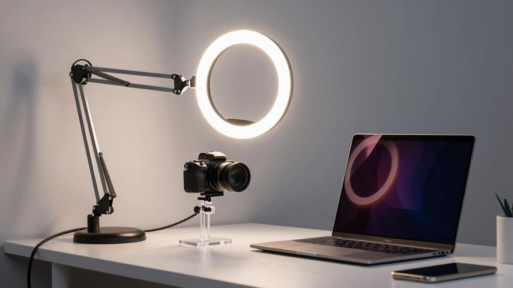 I recommend using adjustable desk mounts with flexible arms for your ring light. They’re easy to clamp onto your desk, saving space, and allow you to position the light precisely where you need it. Look for sturdy, easy-to-adjust options with a good range of motion. This setup guarantees your lighting is ideal for video calls, and it stays out of your way when you’re working or streaming.