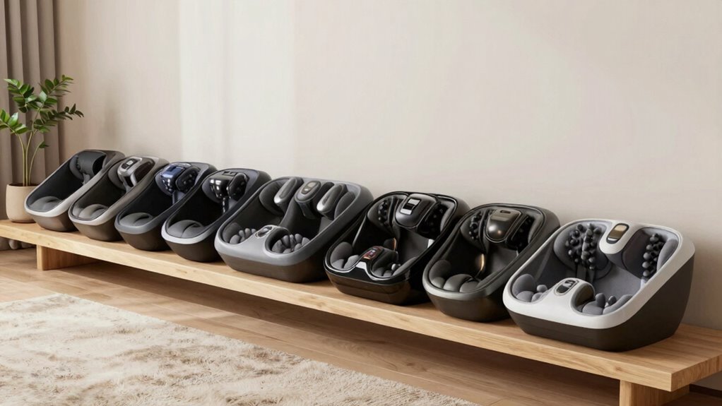 Not all models accommodate different foot sizes comfortably, so I always check the sizing options before buying. I look for adjustable features like extendable straps or customizable settings to guarantee a snug fit for my feet. It’s important because a good fit enhances the massage experience and prevents discomfort. I recommend reading reviews and product details carefully to find a model that genuinely fits your foot size and shape.