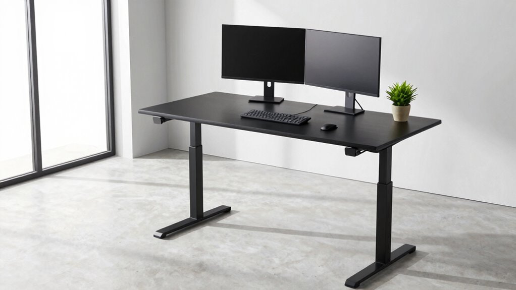 When choosing a standing desk capable of supporting up to 300 lbs, the adjustability range plays a key role in guaranteeing comfort and versatility. Most models offer height adjustments from about 23.6 inches to 50 inches, accommodating different ergonomic needs. The span can vary, with some desks providing 16 to 26 inches of movement, making it easy to switch between sitting and standing positions. Dual motor systems often deliver smoother and faster height shifts within this range, enhancing user experience. Many desks also include preset memory settings, so you can save your preferred heights for quick adjustments. Overall, a flexible adjustability range ensures that users of various heights can work comfortably and efficiently, adapting to different tasks and equipment setups.