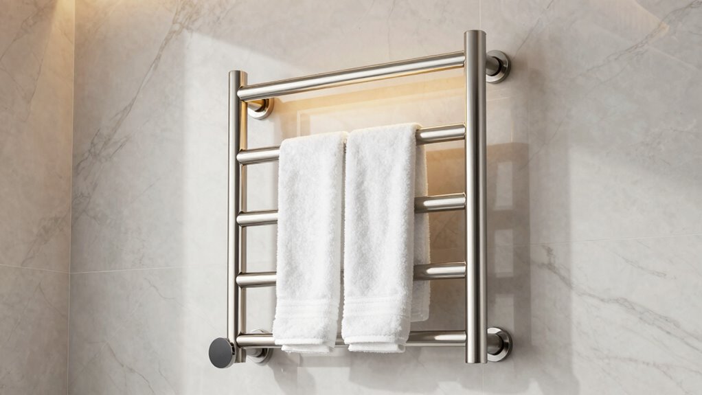 To keep your towel warmer rack in top shape, I recommend regular cleaning with a soft, damp cloth to prevent dust buildup. Check the electrical connections periodically and verify there’s no corrosion or damage. It’s also good to inspect the heating element occasionally for signs of wear. Avoid using harsh chemicals, and follow the manufacturer’s instructions for maintenance to prolong its lifespan and ensure safe operation.