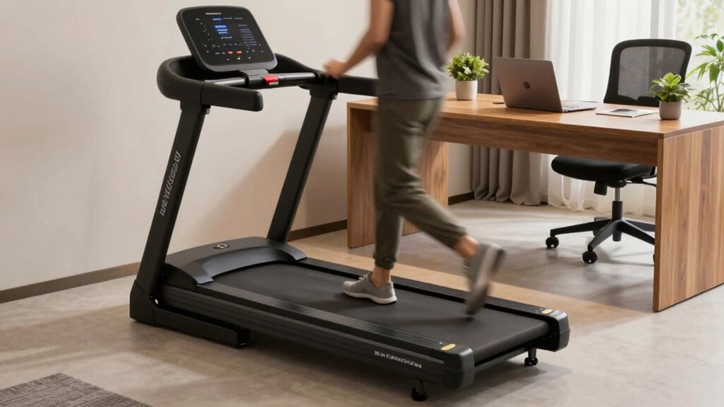 Adjustable incline features add a new dimension to your walking experience by allowing you to simulate uphill terrain. This not only boosts workout intensity but also helps burn more calories in less time. Treadmills with multiple incline levels, like 8% or 12%, let you customize your routine to meet your fitness goals, whether it’s building strength or improving cardiovascular health. Incremental incline adjustments enable seamless progressions between flat and inclined walking, so you can stay focused on your work without interruptions. Varying the incline during your session keeps workouts engaging and prevents boredom, encouraging consistent use. Automated or manual controls make it easy to change the incline effortlessly, making these treadmills versatile tools for enhancing your walking routine while working.