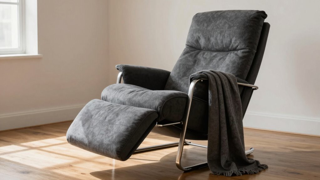 Choosing the right zero gravity chair for indoor use means prioritizing comfort and ergonomic support, which are essential for extended lounging sessions. An ergonomic design should evenly distribute my body weight, reducing pressure on my shoulders, back, and hips. Adjustable headrests and lumbar support are key, allowing me to personalize my alignment and minimize strain during long periods of use. Supportive cushions made from breathable, high-quality materials help improve airflow and prevent overheating, keeping me comfortable. The chair’s recline range, typically from 90° to 170°, is vital for customizing my position to achieve the perfect zero gravity posture. A well-designed ergonomic structure promotes natural spinal alignment, minimizing discomfort and supporting healthy posture, so I can relax fully without worry.